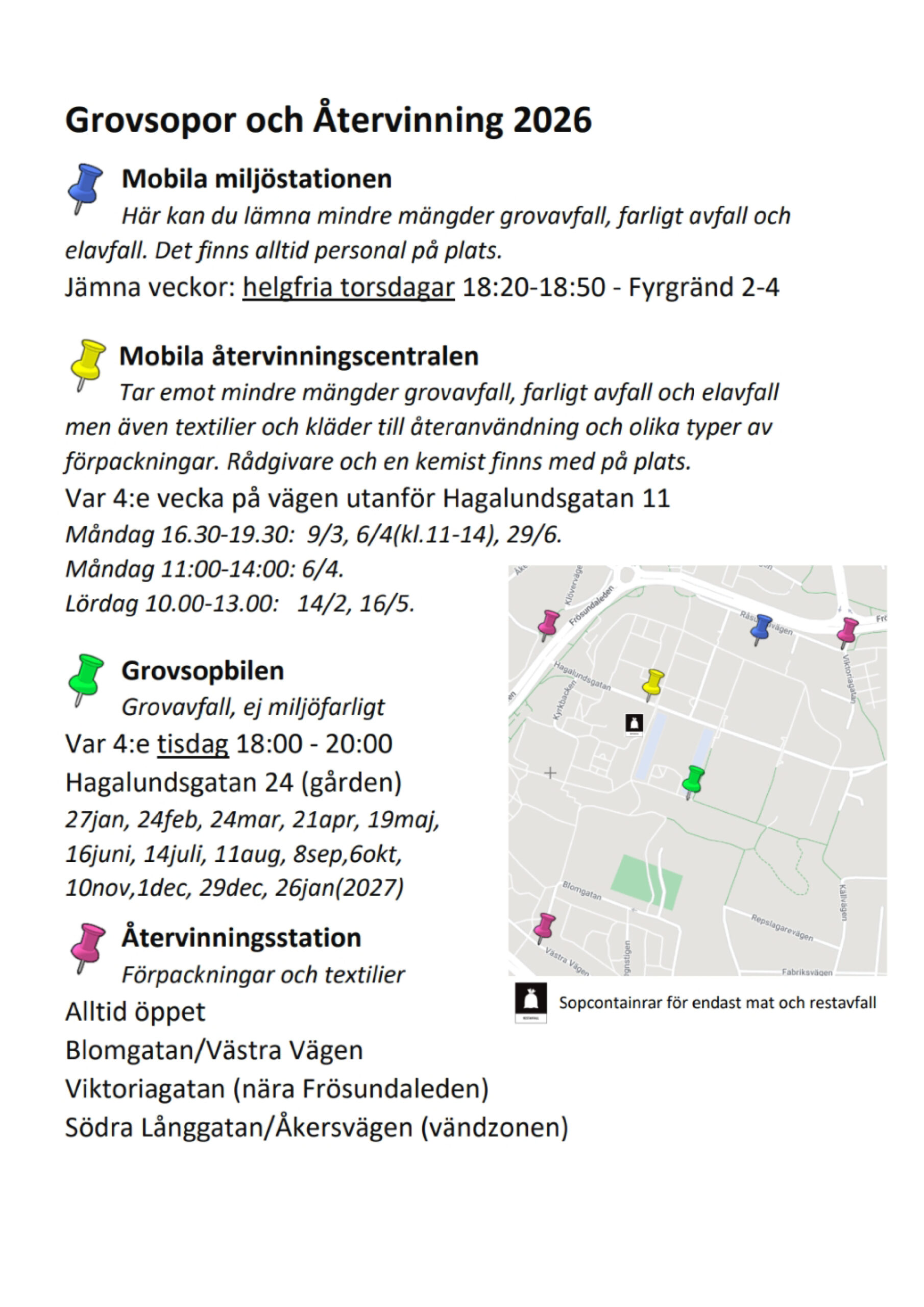 Mer detaljer finns hos Solna Stad: https://www.solna.se/boende-miljo/avfall-atervinning/sortera-lamna-avfall/mobila-miljostationen/